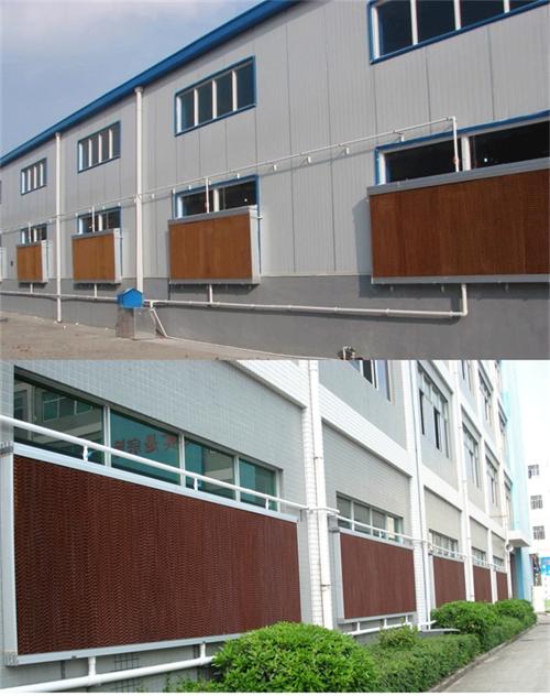 降溫方法二: 負壓濕水簾風機降溫也是很多客戶選擇的水簾墻適用環(huán)境及效果  負壓風機通過自動控制系統(tǒng)實現(xiàn)風機百葉的自動開啟和關閉達到防塵、防水、美觀的效果。噪音低、風量大、耗電少、降溫效果明顯;既可吹風、也可抽風,質(zhì)量保證,是廠房等降溫通風的比較合適選擇。 福泰降溫濕簾”降溫是通過蒸發(fā)降溫的一種經(jīng)濟的降溫方式。干熱空氣通過水簾進入室內(nèi),由于水簾內(nèi)孔壁均勻布滿水膜,這樣室外新鮮空氣穿過水簾時,水簾上的水會吸收空氣中的熱量并產(chǎn)生蒸發(fā)現(xiàn)象,使新鮮空氣溫度下降,濕度增加,完成降溫過程,從而使廠房里的空氣變得涼爽、濕潤 。