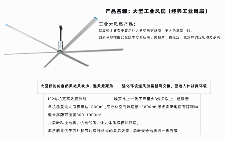 1、風(fēng)量大覆蓋廣:每分鐘空氣流通量15000m3,單機(jī)最大覆蓋面積可達(dá)2000平方米; 2、極小的投資良好的效果,超高性價(jià)比:廠房面積過大,安裝空調(diào)成本太高,一般通風(fēng)設(shè)備沒有用武之地而大風(fēng)扇能以小投資,達(dá)到良好的綜合效果; 3、取代空調(diào):可使人體感受約5-7℃的溫差效應(yīng),部分場所可與傳統(tǒng)空調(diào)輪值使用,從而一定程度上達(dá)到取代中央空調(diào)的效果; 4、高效節(jié)能:配置永磁直驅(qū)電機(jī)效率進(jìn)一步提高,更節(jié)能,每小時(shí)實(shí)際耗電0.8-1.2千瓦; 5、免維護(hù)壽命長,專業(yè)無憂服務(wù):創(chuàng)新技術(shù),低轉(zhuǎn)速、磨損少,免維護(hù),壽命長;18年行業(yè)前沿服務(wù)經(jīng)驗(yàn),擁有大量應(yīng)用案例,為用戶提供獨(dú)到的高價(jià)值一站式解決方案; 6、品質(zhì)穩(wěn)定:高端配置,品質(zhì)穩(wěn)定性極高,性能卓著。
